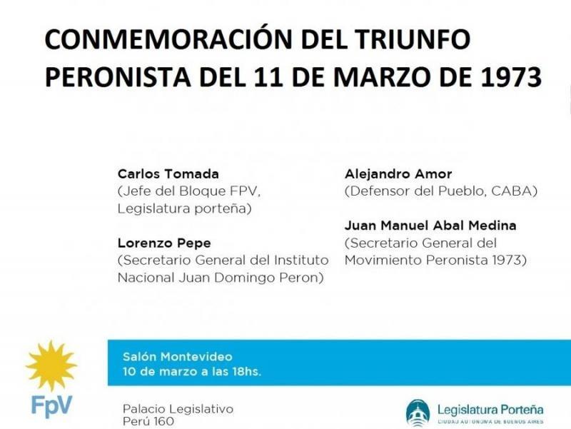 Será hoy a las 18 en a Legislatura porteña. 10/03/2017 POLíTICA Conmemoran el triunfo peronista de 1973