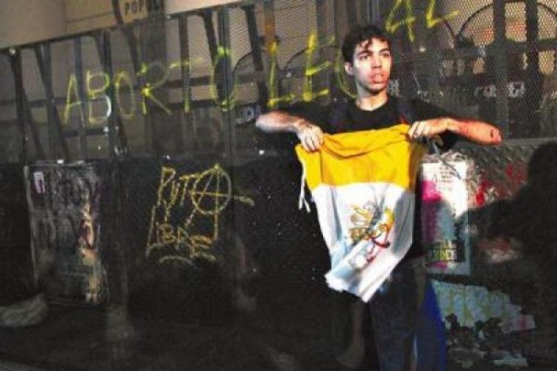 Luego de la marcha por el Día Internacional de la Mujer, un jóven apareció frente a la Catedral con una bandera del Vaticano en actitud de provocación ¿Quién es? 10/03/2017 POLíTICA Incidentes en la Catedral: ¿quién es el provocador neonazi que es cercano a Cambiemos?