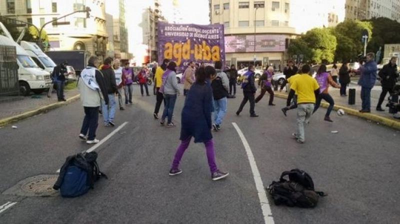 Un grupo de docentes universitarios de la UBA realizó una singular protesta que constó de un partido de fútbol en pleno... 26/04/2016 SOCIEDAD Docentes universitarios jugaron un "picadito" en el Obelisco contra el ajuste salarial