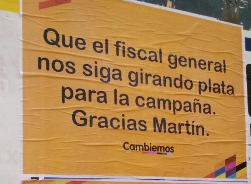 La ciudad amaneció empapelada con afiches increpando al fiscal Martin Ocampo para que "gire más plata para la campaña". 23/10/2015 POLíTICA Aparecieron carteles de Cambiemos contra el fiscal general