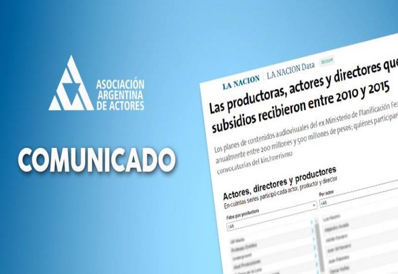 Varios artistas repudiaron la nota titulada "Las productoras, actores y directores que más subsidios recibieron entre 2010 y 2015", publicada esta semana en el diario La Nación. 18/12/2015 SOCIEDAD Asociación de Actores manifestó su rechazo a una publicación del diario La Nación